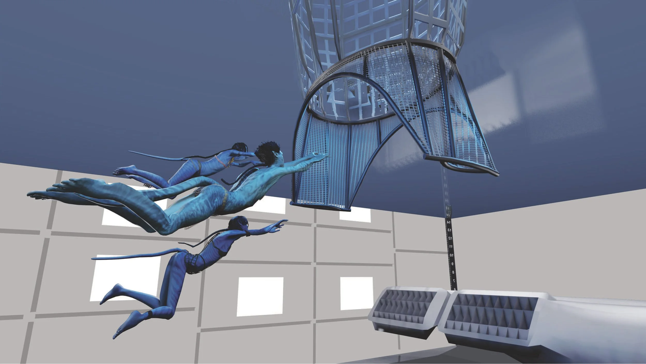The Air Bell was a powder-coated aluminum pipe structure rigged with a custom cargo net. This proxy was installed with the bottom half in the water so the performers could approach from underwater and climb into the air pocket of the Air Bell. As the action continued, SPFX Coordinator Richard Schwalm released the cargo net from the frame as the whole proxy dropped into the water to simulate a collapse from an attacking Crab Suit.